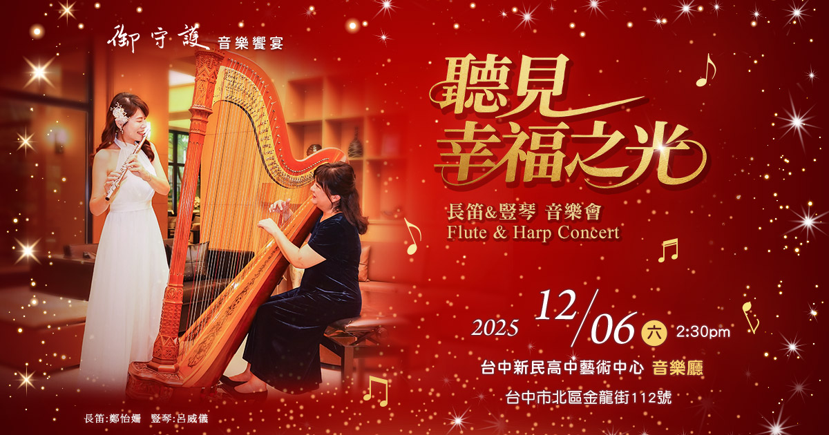 長期支持 勵馨基金會 小媽媽與小腳丫服務的「御守護」,十二月六日下午兩點三十分將在新民高中藝術中心舉辦「御守護 聽見幸福之光|長笛 X 豎琴音樂會」,邀請民眾在旋律間慢下腳步,在悠揚的長笛與豎琴交織之中,再次感受生命的光亮,聽見幸福的模樣。